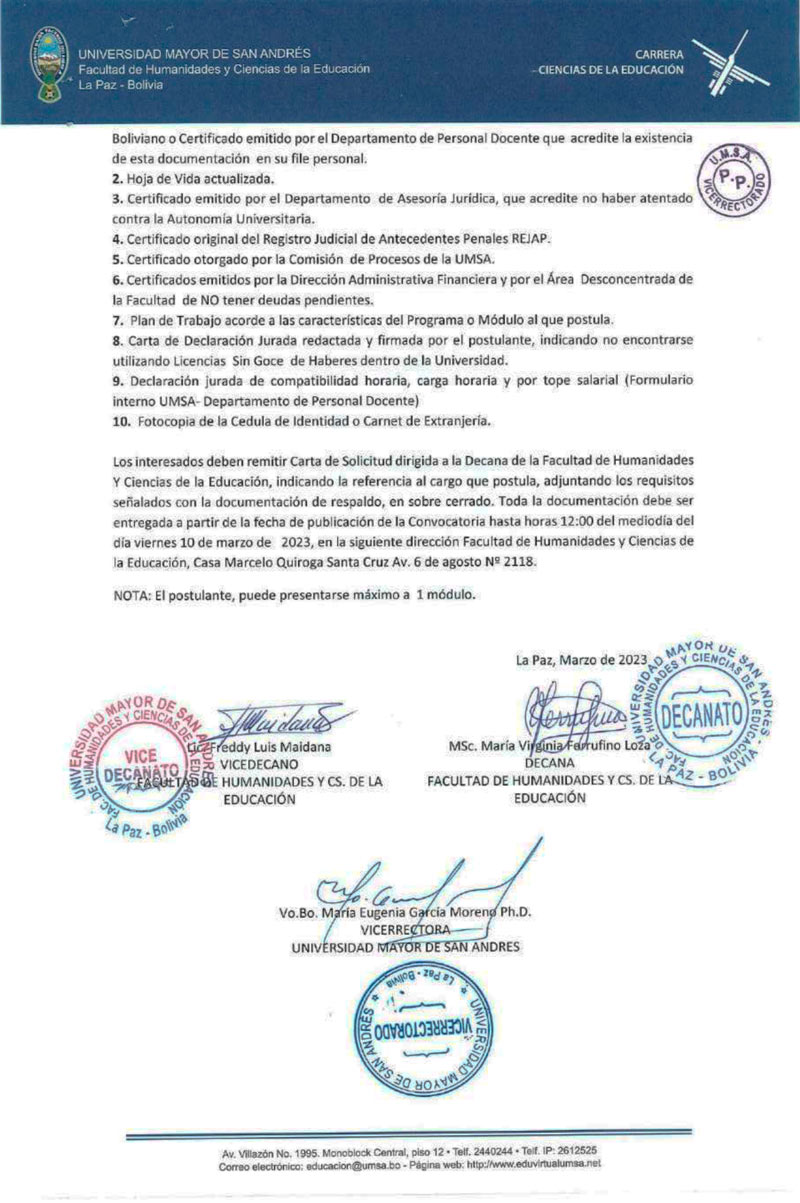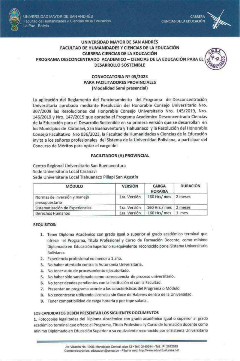 La carrera de Ciencias de la Educación, dependiente de la Facultad de Humanidades y Ciencias de la Educación de la #UMSA, invita a profesionales del Sistema de la Universidad Boliviana, a participar del concurso de méritos para: • Facilitador(a) Provincial (modalidad semipresencial - gestión académica 2023)