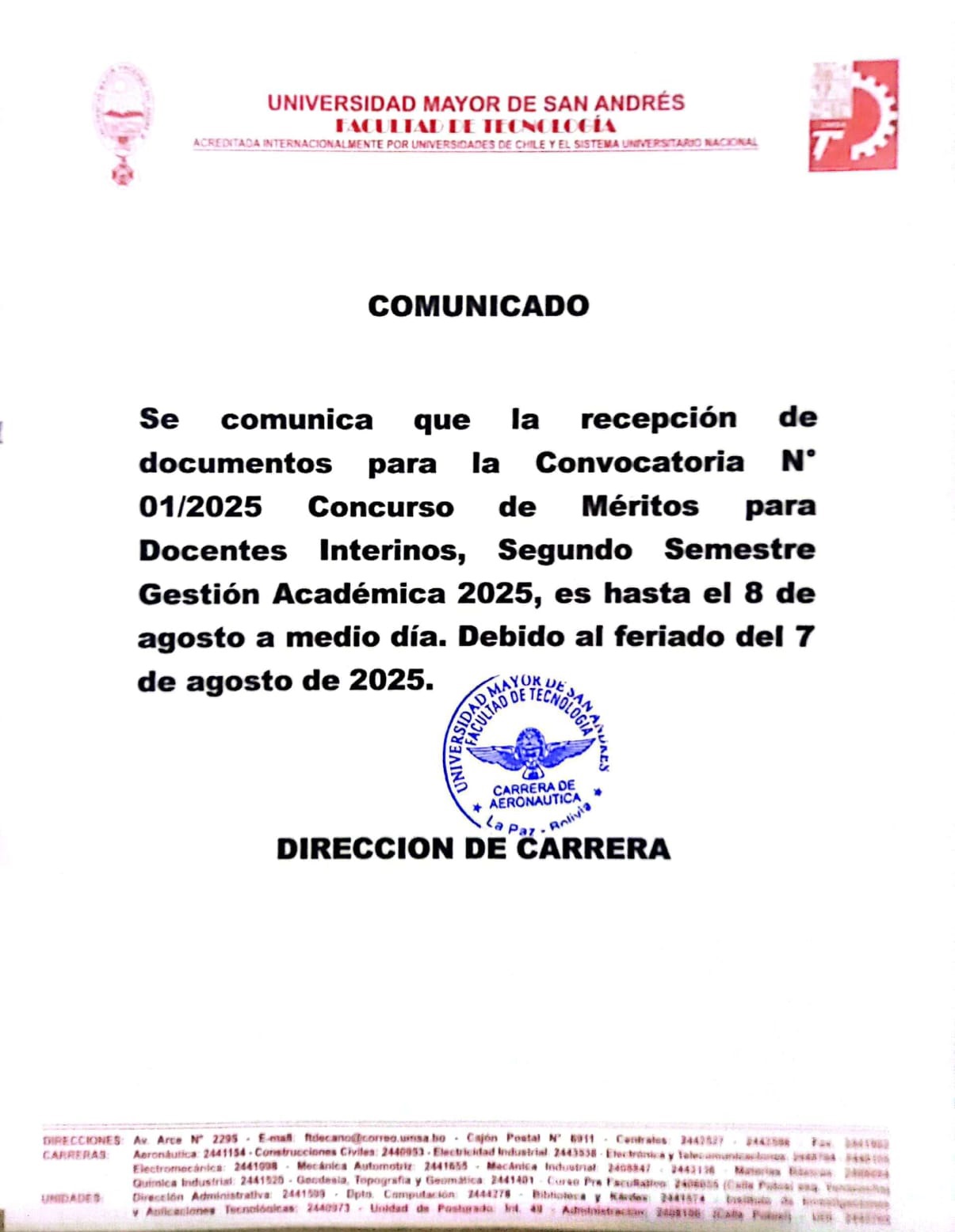 NOTA.- La solicitud con la documentación completa debe ser entregada en un folder, debiendo encontrarse en el orden citado en la convocatoria, separado y foliado, a partir del día lunes 24 de noviembre de 2025 hasta el día lunes 8 de diciembre de 2025, en Secretaría de Vicedecanato de la Facultad de Tecnología, Av. Arce N° 2295, 2do piso, teléfono 2442598.
