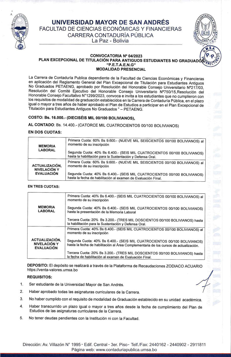 ➡ CONVOCATORIA: La carrera de Contaduría Pública, de la Facultad de Ciencias Económicas y Financieras de la #UMSA invita a los estudiantes que no cumplieron los requisitos de modalidad de graduación en el plazo igual o mayor a tres años a participar del: