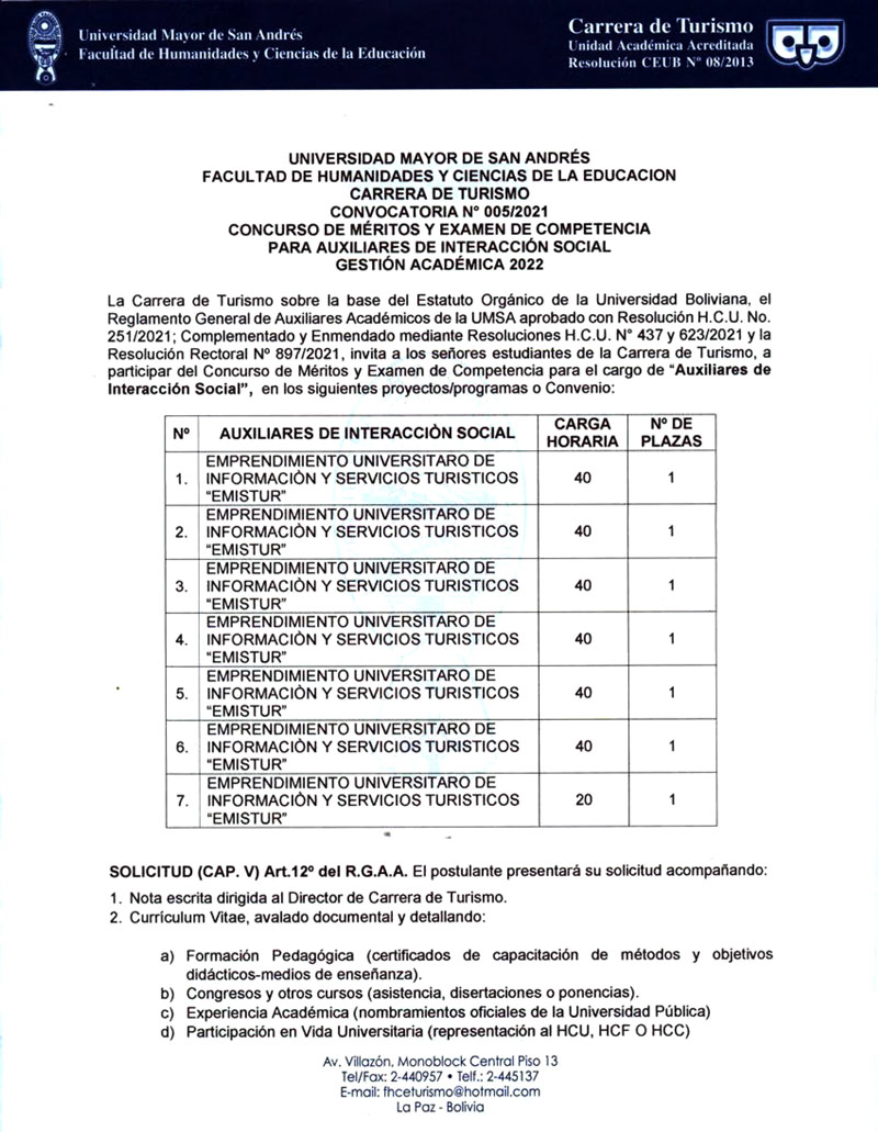 La Carrera de Turismo sobre la base del Estatuto Orgánico da la Universidad Boliviana, el Reglamento General de Auxiliares Academ0os de la UMSA aprobado con Resolución H.C.U. No. 251/2021; Complementado y Enmendado mediante Resoluciones HOU. N° 437 y 623/2021 y la Resolución Rectoral N° 897/2021. Invita a los señores estudiantes de la Carrera de Turismo, a participar del Concurso de Mitos y Examen de Competencia para el cargo de "Auxiliar. de Interacción Social, para proyectos/programas o convenio.