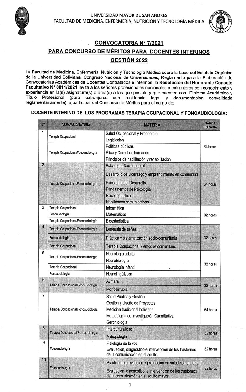 La Facultad de Medicina, Enfermería, Nutrición y Tecnología Médica sobre la base del Estatuto Orgánico de la Universidad Boliviana, Congreso Nacional de Universidades, Reglamento para la Elaboración de Convocatorias Académicas de Docentes Contratados e Interinos, la Resolución del Honorable Consejo Facultativo N° 0811/2021 invita a los señores profesionales nacionales o extranjeros con conocimiento y experiencia en la(s) asignatura(s) o área(s) a las que postula y que cuenten con Diploma Académico y Título Profesional (para extranjeros con residencia legal y documentación convalidada reglamentariamente), a participar del Concurso de Méritos