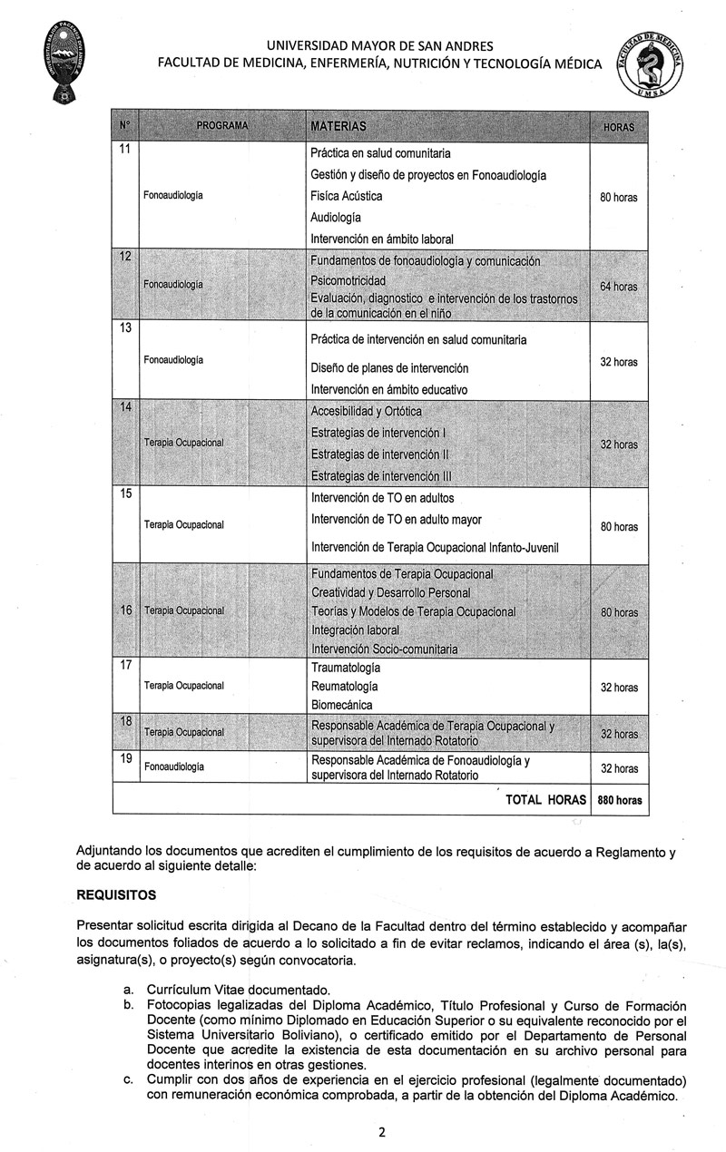 La Facultad de Medicina, Enfermería, Nutrición y Tecnología Médica sobre la base del Estatuto Orgánico de la Universidad Boliviana, Congreso Nacional de Universidades, Reglamento para la Elaboración de Convocatorias Académicas de Docentes Contratados e Interinos, la Resolución del Honorable Consejo Facultativo N° 830/2021 invita a los señores profesionales nacionales o extranjeros con conocimientos y experiencia en la(s) asignatura(s) o área(s) a las que postula y que cuenten con Diploma Académico y Título Profesional (para extranjeros con residencia legal y documentación convalidada reglamentariamente), a participar del Concurso de Méritos y Examen de Competencia.