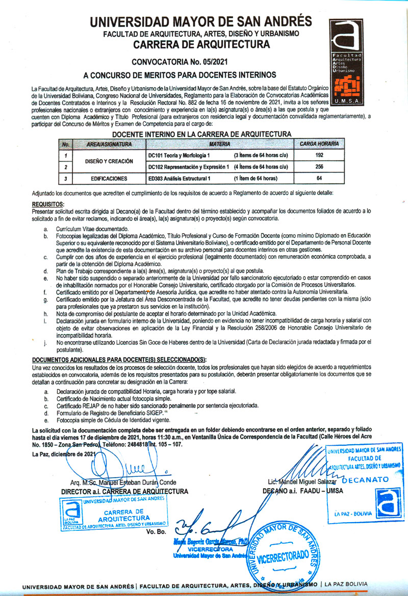 La Facultad de Arquitectura, Artes, Diseño y Urbanismo de la Universidad Mayor de San Andrés, sobre la base del Estatuto Orgánico de la Universidad Boliviana, Congreso Nacional de Universidades, Reglamento para la Elaboración de Convocatorias Académicas de Docentes Contratados e Interinos y la Resolución Rectoral No. 882 de fecha 16 de noviembre de 2021, invita a los señores profesionales nacionales o extranjeros con conocimiento y experiencia en la(s) asignatura(s) o área(s) a las que postula y que cuenten con Diploma Académico y Título Profesional (para extranjeros con residencia legal y documentación convalidada reglamentariamente), a participar del Concurso de Méritos y Examen de Competencia para el cargo de: DOCENTE INTERINO EN LA CARRERA DE ARQUITECTURA