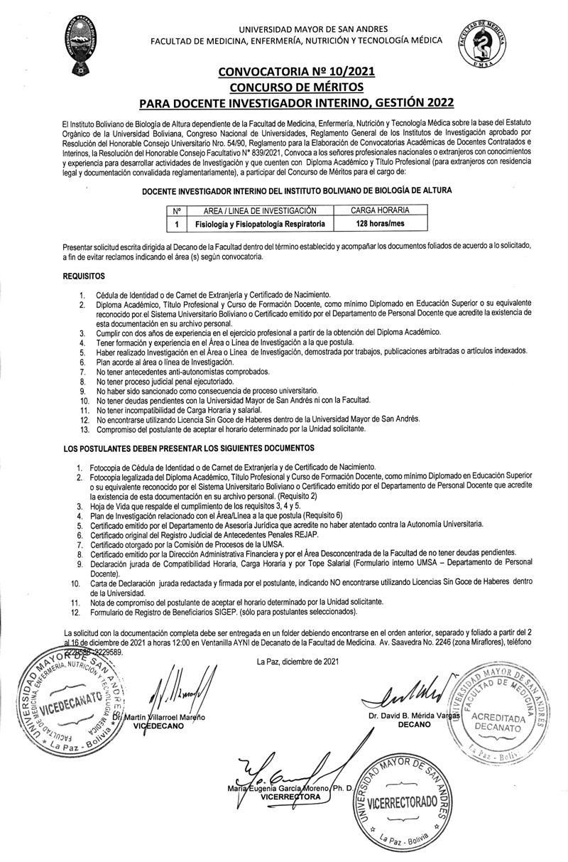 El Instituto Boliviano de Biología de Altura dependiente de la Facultad de Medicina, Enfermería, Nutrición y Tecnología Médica sobre la base del Estatuto Orgánico de la Universidad Boliviana, Congreso Nacional de Universidades, Reglamento General de los Institutos de investigación aprobado por Resolución del Honorable Consejo Universitario Nro. 54190, Reglamento para la Elaboración de Convocatorias Académicas de Docentes Contratados e Interinos, la Resolución del Honorable Consejo Facultativo N' 839/2021, Convoca a los señores profesionales nacionales o extranjeros con conocimientos y experiencia para desarrollar actividades de Investigación y que cuenten con Diploma Académico y Titulo Profesional (para extranjeros con residencia legal y documentación convalidada reglamentariamente), a participar del Concurso de Méritos.