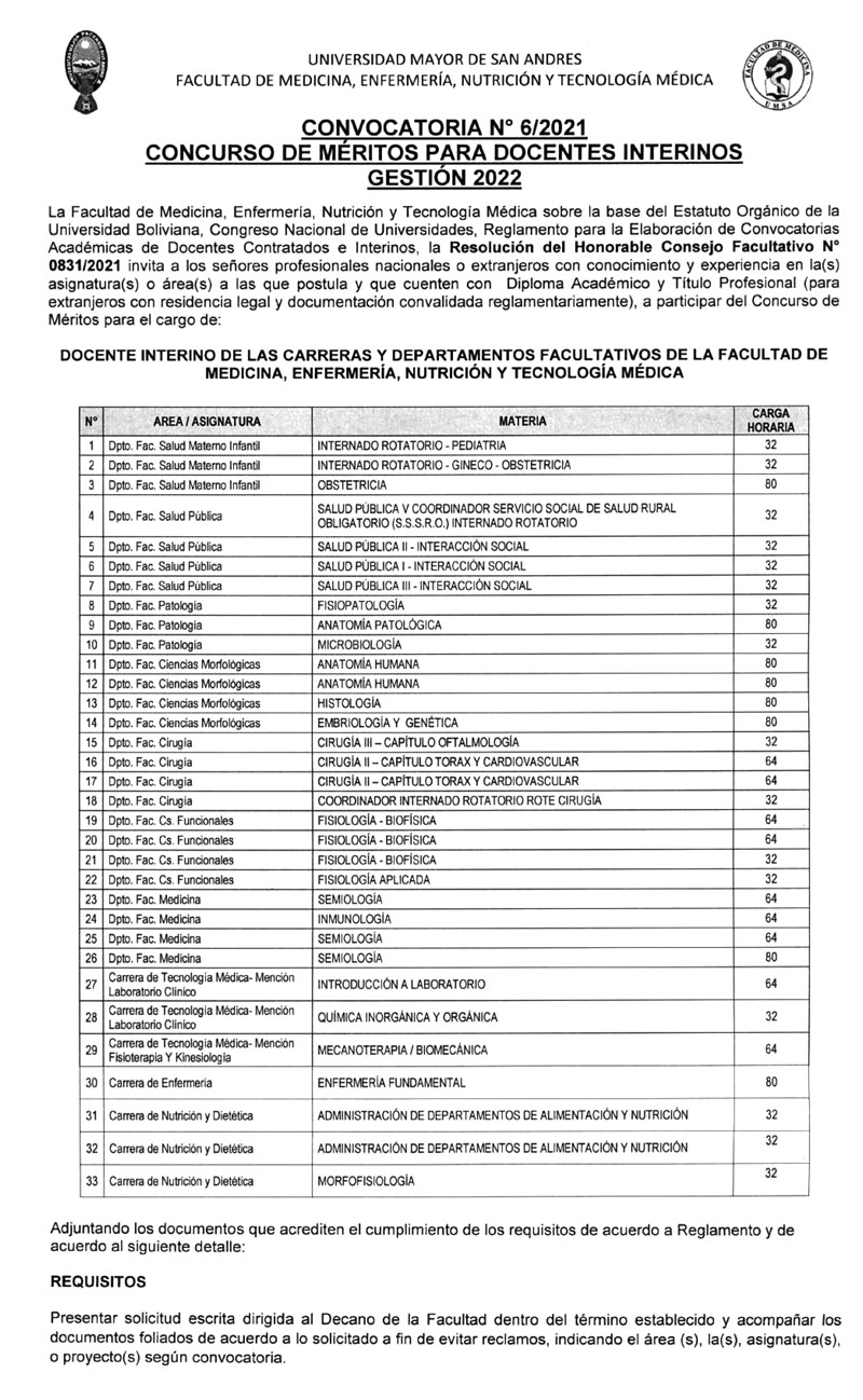 La Facultad de Medicina, Enfermería, Nutrición y Tecnología Médica sobre la base del Estatuto Orgánico de la Universidad Boliviana, Congreso Nacional de Universidades, Reglamento para la Elaboración de Convocatorias Académicas de Docentes Contratados e Interinos, la Resolución del Honorable Consejo Facultativo N° 0831/2021 invita a los señores profesionales nacionales o extranjeros con conocimiento y experiencia en la(s) asignatura(s) o área(s) a las que postula y que cuenten con Diploma Académico y Título Profesional (para extranjeros con residencia legal y documentación convalidada reglamentariamente), a participar del Concurso de Méritos