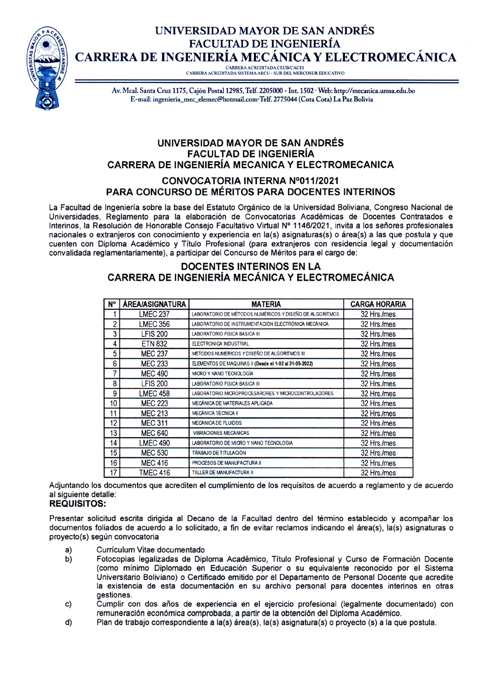 CONVOCATORIA INTERNA N°011/2021 PARA DOCENTES INTERINOS - CARRERA DE INGENIERÍA MECÁNICA Y ELECTROMECÁNICA