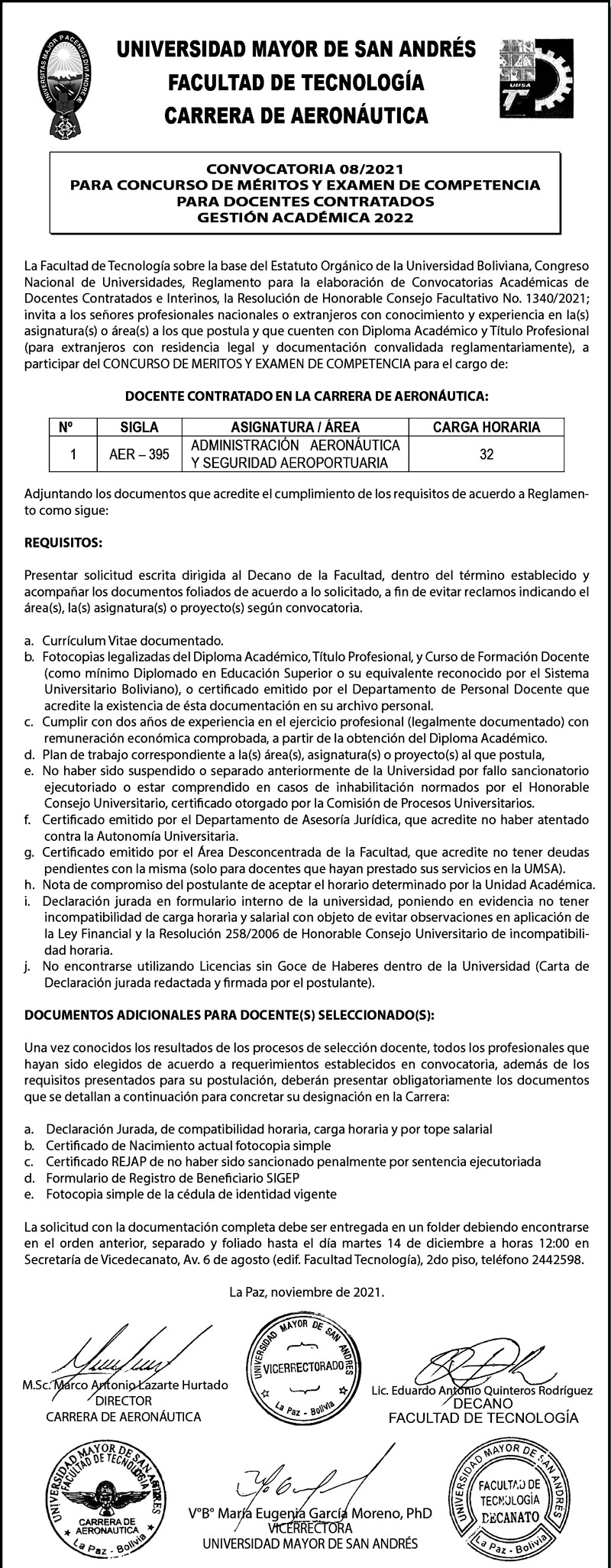 CONVOCATORIA 08/2021 CONCURSO DE MÉRITOS Y EXAMEN DE COMPETENCIA PARA DOCENTES CONTRATADOS - CARRERA DE AERONÁUTICA