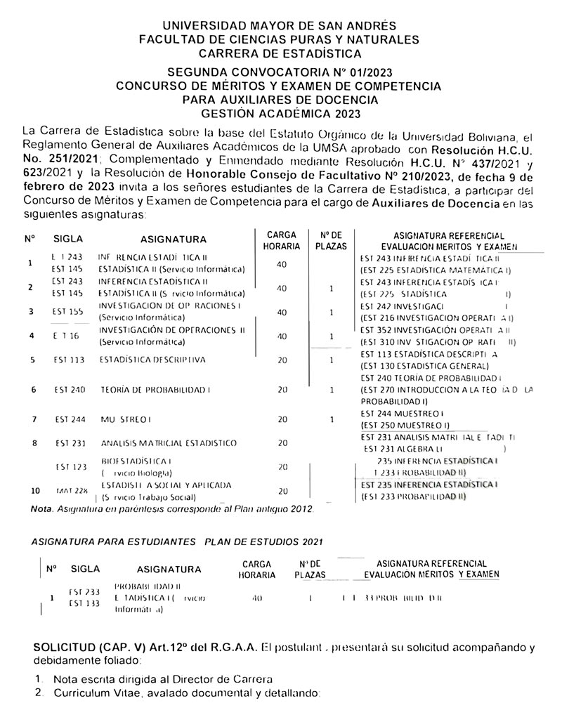 CONVOCATORIA PARA AUXILIARES CARRERA DE ESTADÍSTICA (SEGUNDA CONVOCATORIA – GESTIÓN ACADÉMICA 2023)