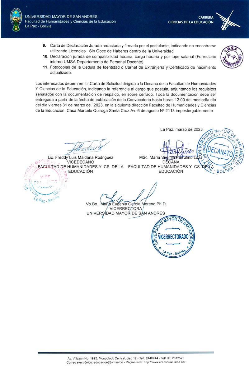La carrera de Ciencias de la Educación, dependiente de la Facultad de Humanidades y Ciencias de la Educación de la #UMSA, invita a profesionales del Sistema de la Universidad Boliviana, a participar del concurso de méritos para: