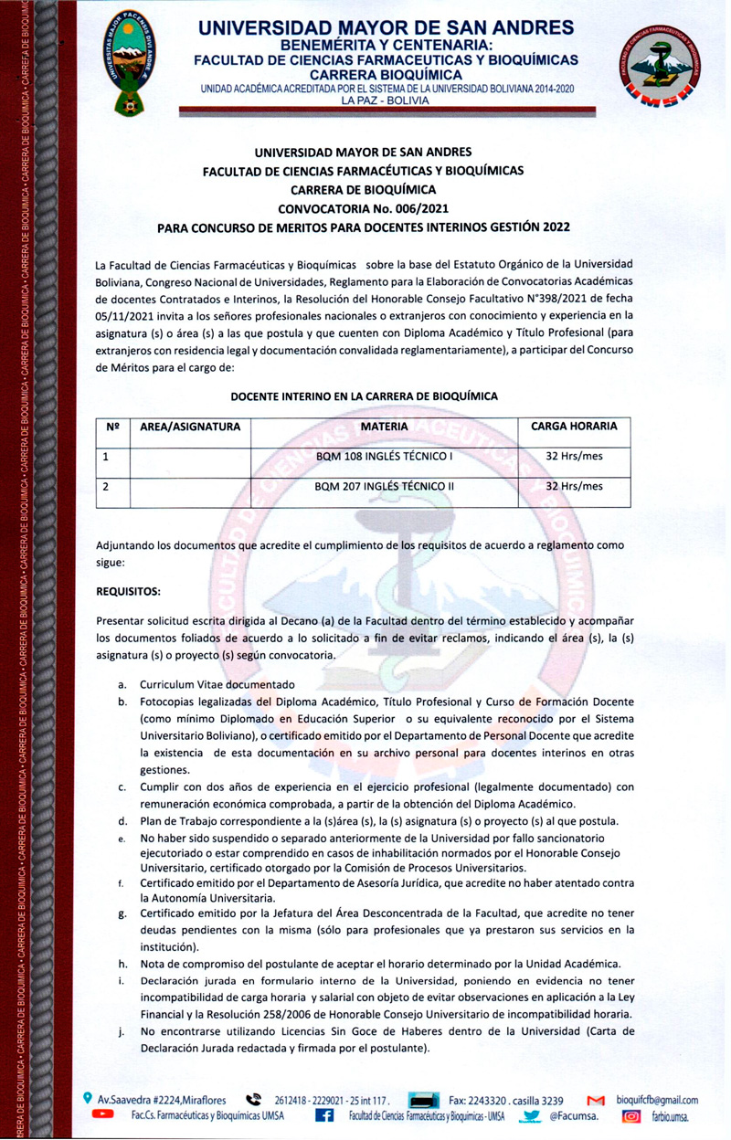 La Facultad de Ciencias Farmacéuticas y Bioquímicas sobre la base del Estatuto Orgánico de la Universidad Boliviana, Congreso Nacional de Universidades, Reglamento para la Elaboración de Convocatorias Académicas de docentes Contratados e Interinos, la Resolución del Honorable Consejo Facultativo N°398/2021 de fecha 05/11/2021 invita a los señores profesionales nacionales o extranjeros con conocimiento y experiencia en la asignatura (s) o área (s) a las que postula y que cuenten con Diploma Académico y Título Profesional (para extranjeros con residencia legal y documentación convalidada reglamentariamente), a participar del Concurso de Méritos.