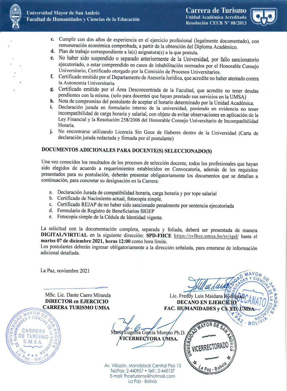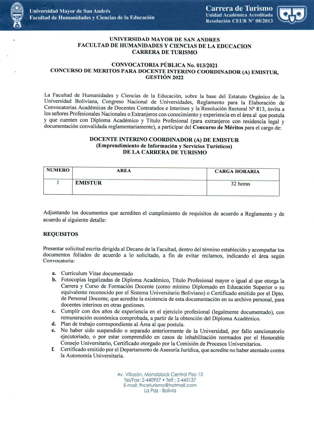 CONVOCATORIA PÚBLICA No. 012/2021 CONCURSO DE MÉRITOS PARA DOCENTES INTERINOS GESTIÓN 2022 - CARRERA DE TURISMO