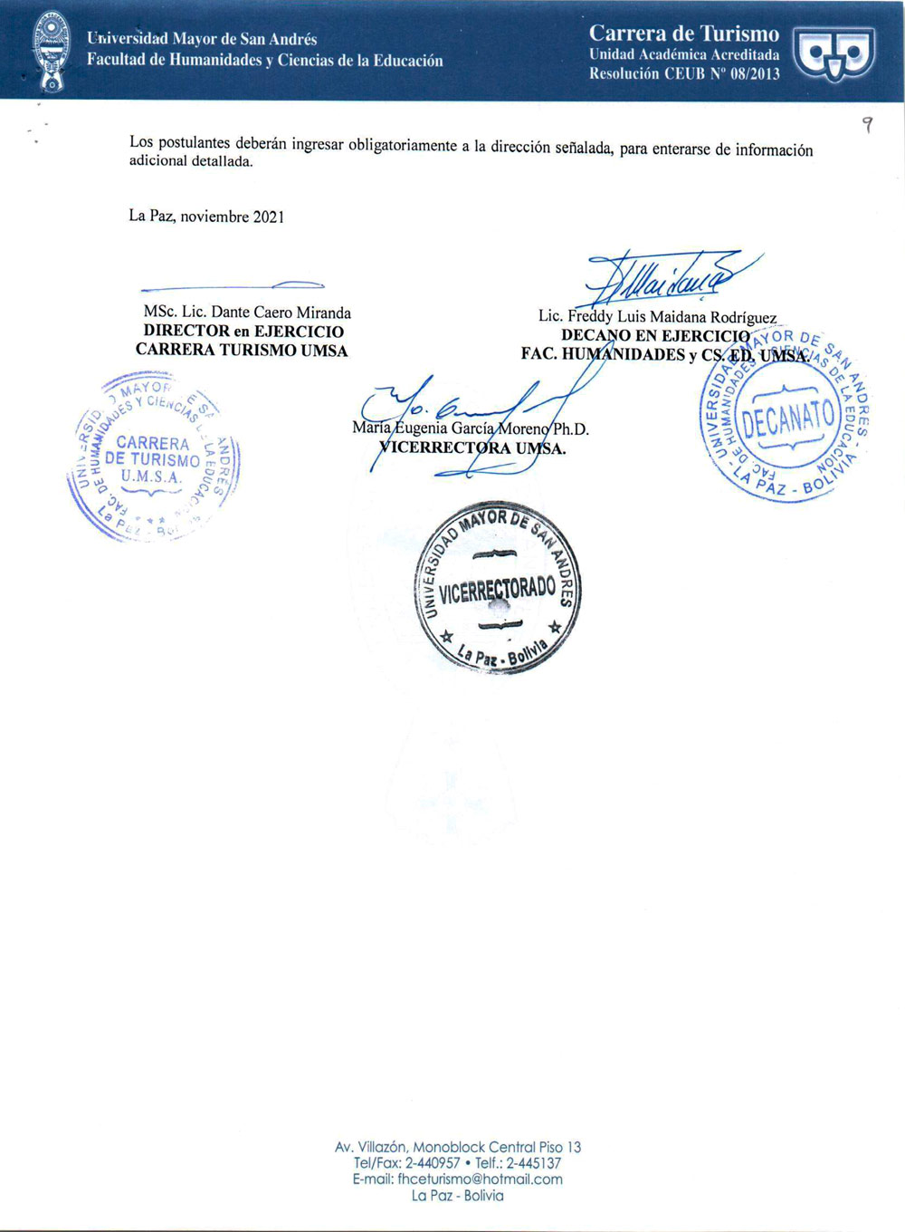 CONVOCATORIA PÚBLICA No. 011/2021 CONCURSO DE MERITOS PARA DOCENTES INTERINOS, GESTIÓN 2022 - CARRERA DE TURISMO